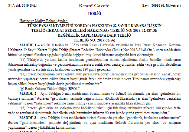 31 Aralık 2019 Tarihli ve 30995 Sayılı Resmi Gazete 5. Mükerrer yayımlanan Tebliğ ile ( Türk Parası Kıymetini Koruma Hakkında 32 Sayılı Karara İlişkin Tebliğ (İhracat Bedelleri Hakkında) (Tebliğ No: 2018-32/48)’de Değişiklik Yapılmasına Dair Tebliğ (No: 2019-32/56) ) İhracat bedellerinini yurda getirilmesine ilişkin düzenlemelerde önemli değişiklikler oldu.